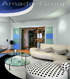 Холодный стиль гостиной оживили натяжным потолком синего цвета и стеклянными раздвижными дверьми с использованием зеленой и голубой цветовой гаммы.