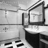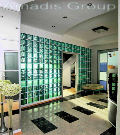 Открытые раздвижные двери и перегородка, выполненная из стекла зеленых оттенков, позволяют естественному свету проникать в холл. А зеркала и зеркальная плитка рассеивают его по всему пространству.